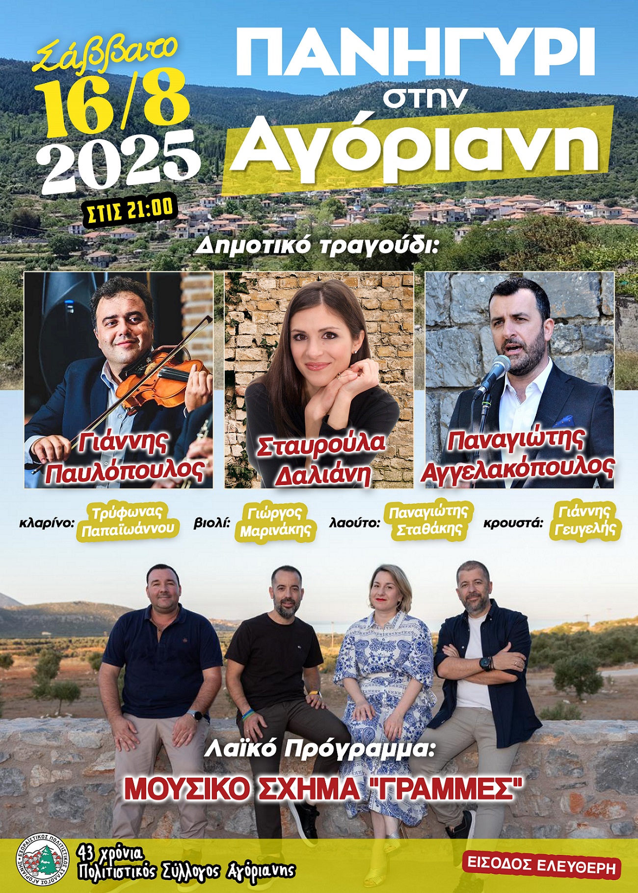 Όπως κάθε χρόνο, έτσι και φέτος τον Αύγουστο, ο Εξωραϊστικός Πολιτιστικός Σύλλογος Αγόριανης διοργανώνει εβδομάδα εκδηλώσεων στην καρδιά του Ταϋγέτου. Παράδοση, θέατρο, σωματική δραστηριότητα-άθληση, πάρτι νεολαίας και λαϊκό πανηγύρι συνθέτουν το «μωσαϊκό» των δράσεων.