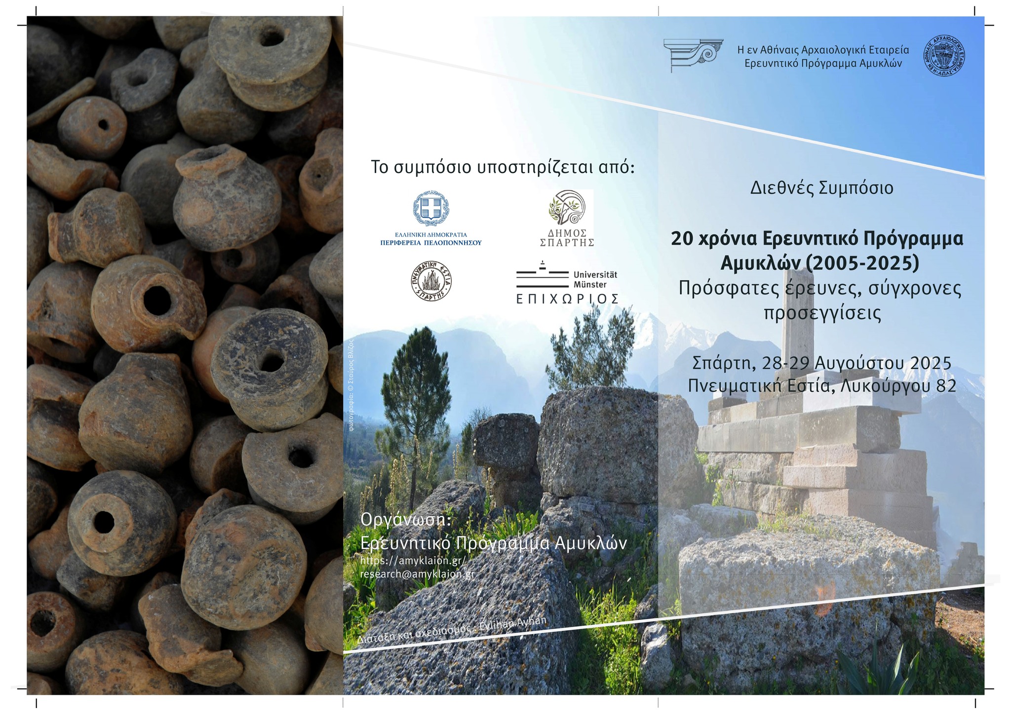 Στη Σπάρτη θα πραγματοποιηθεί, κατά το διήμερο 28-29 Αυγούστου, το διεθνές συμπόσιο με θέμα «20 χρόνια Ερευνητικό Πρόγραμμα Αμυκλών (2005-2025): Πρόσφατες έρευνες, σύγχρονες προσεγγίσεις», το οποίο διοργανώνει η Εν Αθήναις Αρχαιολογική Εταιρεία και το Ερευνητικό Πρόγραμμα Αμυκλών.