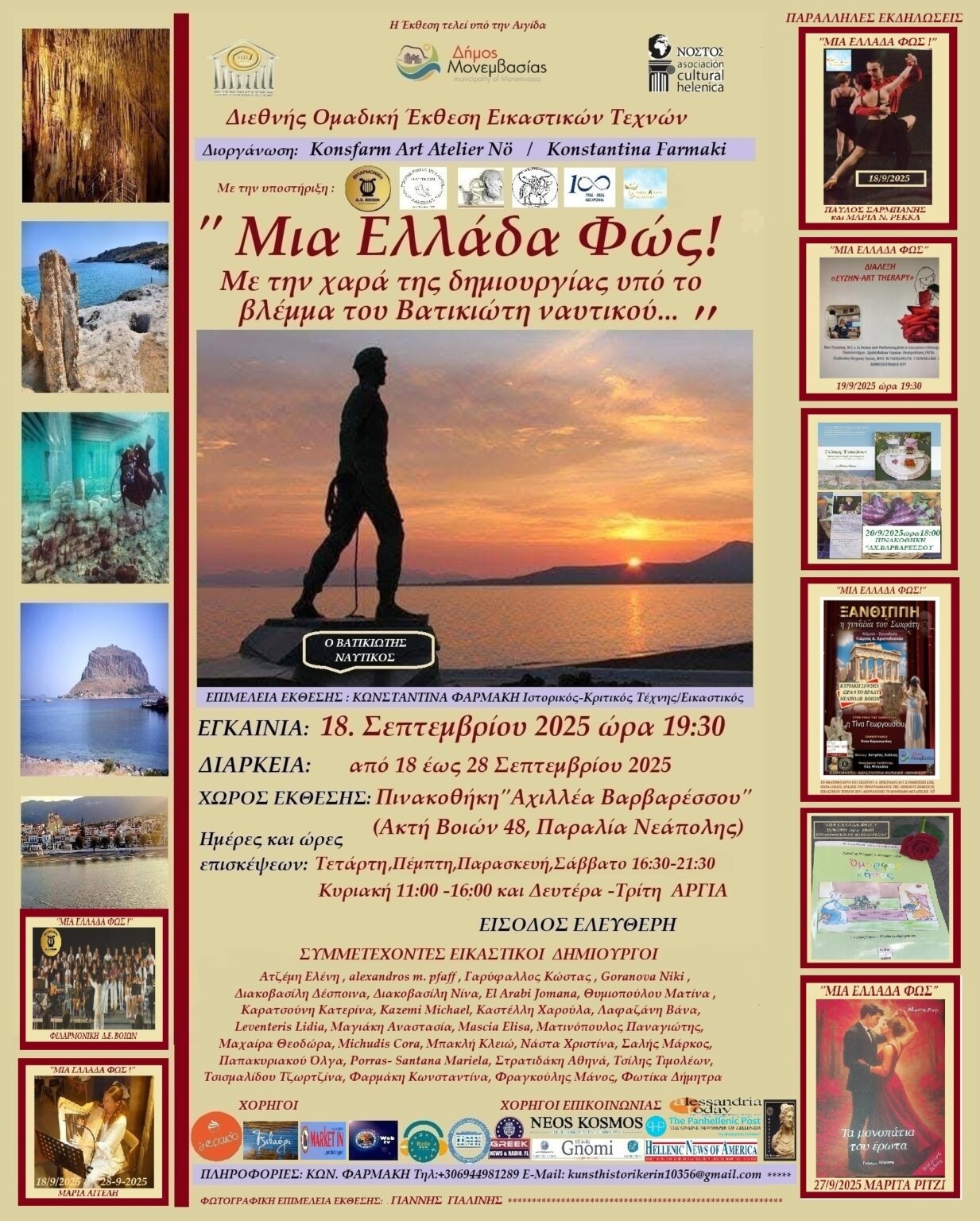 Η έκθεση τελεί υπό την αιγίδα του Δήμου Μονεμβασίας, του Ομίλου για την UNESCO Τεχνών, Λόγου και Επιστημών Ελλάδος, και της Ελληνικής Πολιτιστικής Οργάνωσης «NOSTOS» με έδρα το Μπουένος Άιρες της Αργεντινής. Θα ανοίξει τις πόρτες της στην Πινακοθήκη «Αχιλλέα Βαρβαρέσσου» στην παραλία Νεάπολης (Ακτή Βοιών 48), στο διάστημα από 18 έως 28 Σεπτεμβρίου 2025. Τα εγκαίνια θα πραγματοποιηθούν την Πέμπτη 18 Σεπτεμβρίου και ώρα 7:30΄ μμ.