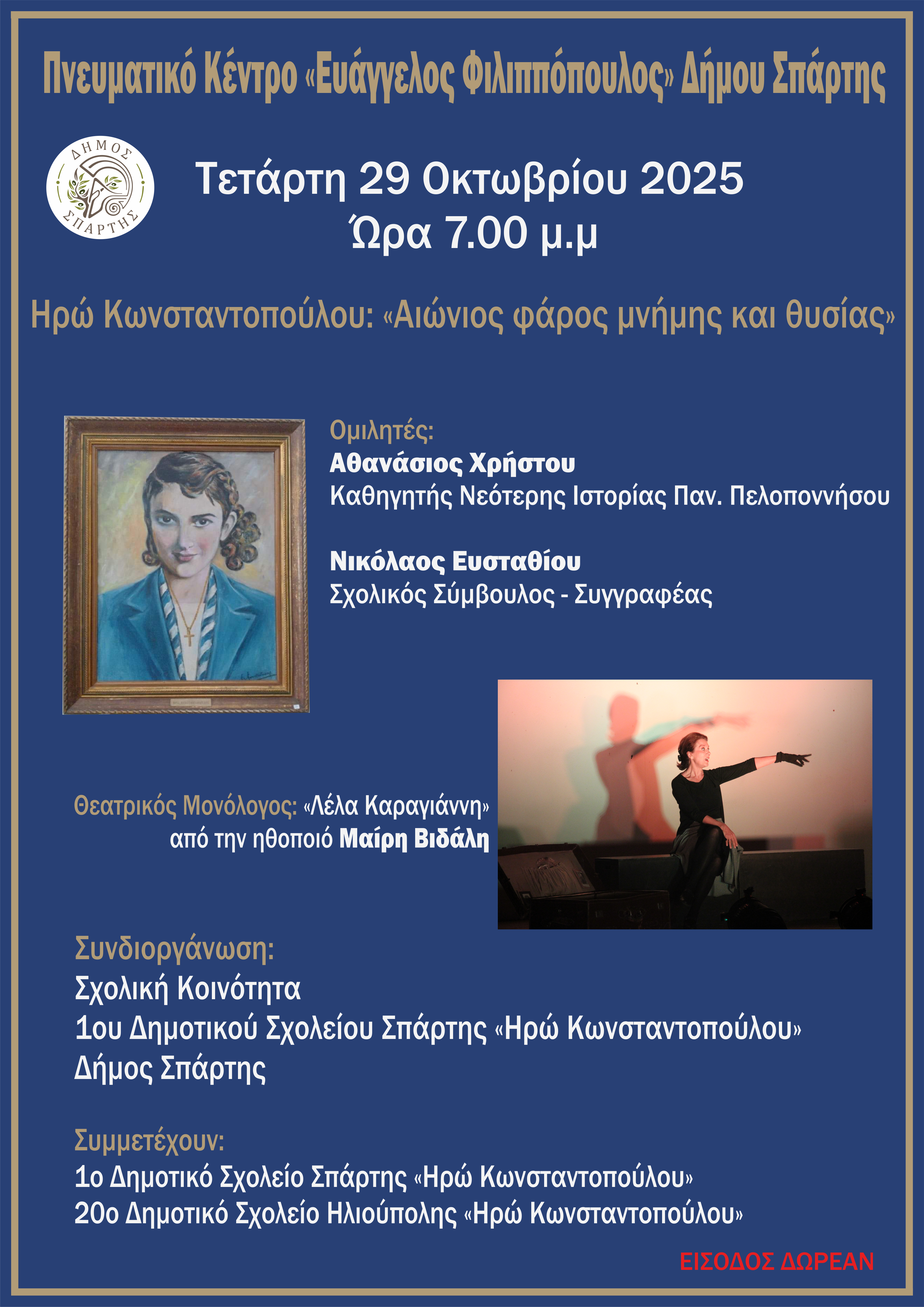 Η εκδήλωση με τίτλο «Ηρώ Κωνσταντοπούλου: Αιώνιος φάρος μνήμης και θυσίας» θα πραγματοποιηθεί την Τετάρτη 29 Οκτωβρίου, στις 19:00, στην αίθουσα «Ευάγγελος Φιλιππόπουλος» του Πνευματικού Κέντρου Δήμου Σπάρτης.