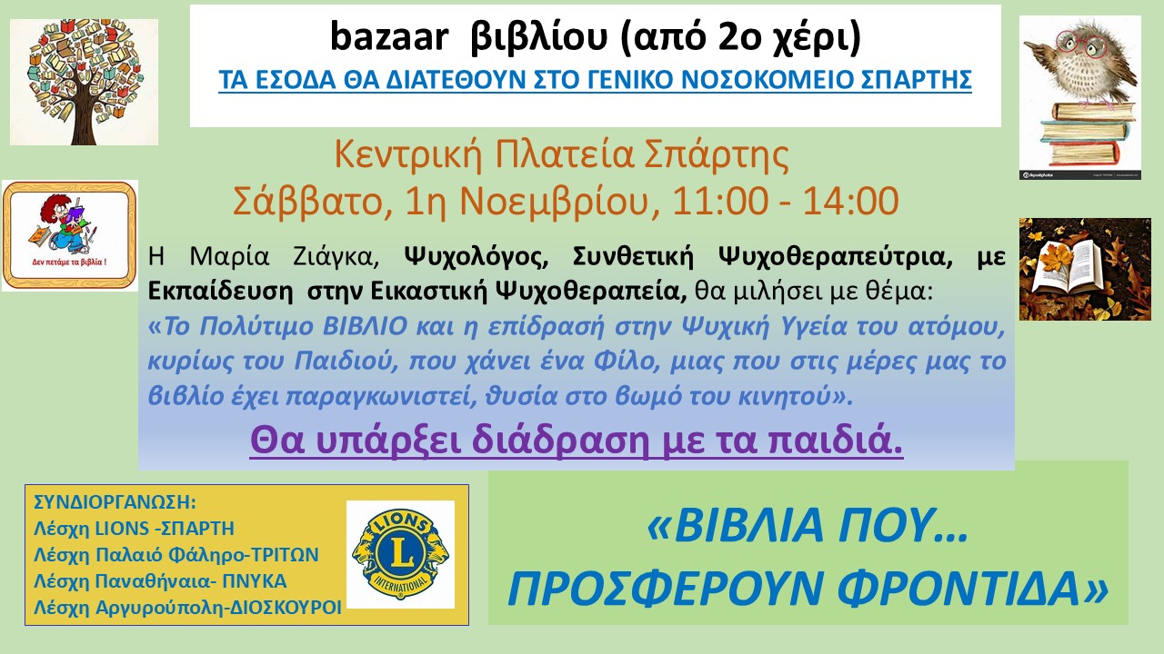 Ένα διαφορετικό και βαθιά ανθρώπινο bazaar βιβλίου διοργανώνει η Λέσχη Lions Σπάρτης το Σάββατο 1η Νοεμβρίου, από τις 11:00 έως τις 14:00, στην κεντρική πλατεία της πόλης.