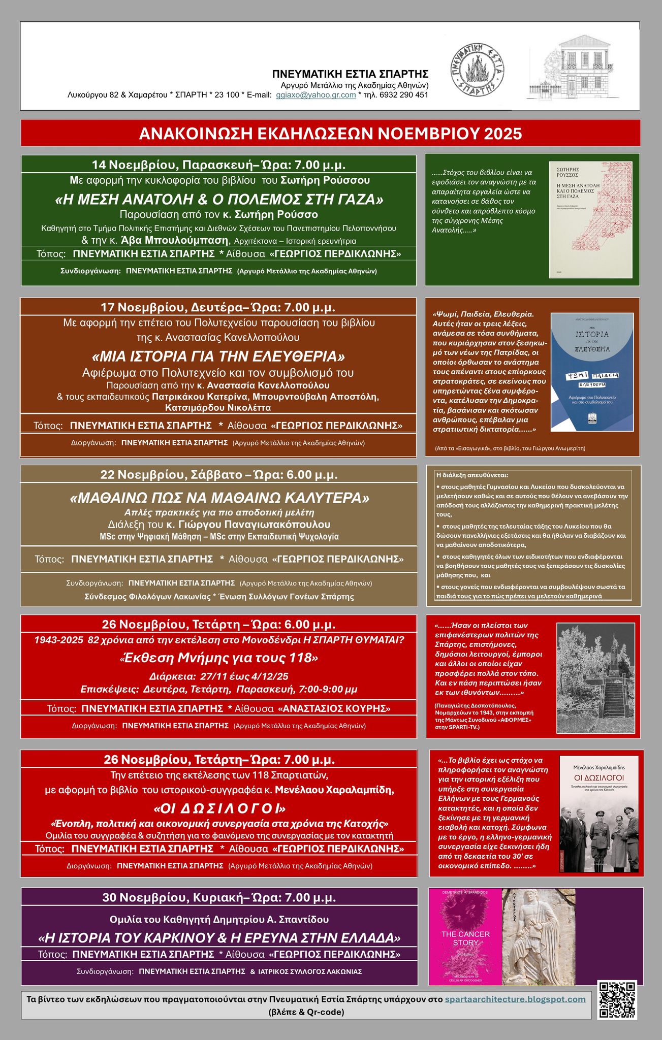 Η Πνευματική Εστία Σπάρτης, τιμημένη με το Αργυρό Μετάλλιο της Ακαδημίας Αθηνών, ανακοινώνει έναν ιδιαίτερα πλούσιο κύκλο εκδηλώσεων για τον μήνα Νοέμβριο, αφιερωμένο στη μνήμη, την αντίσταση και την ενημέρωση.