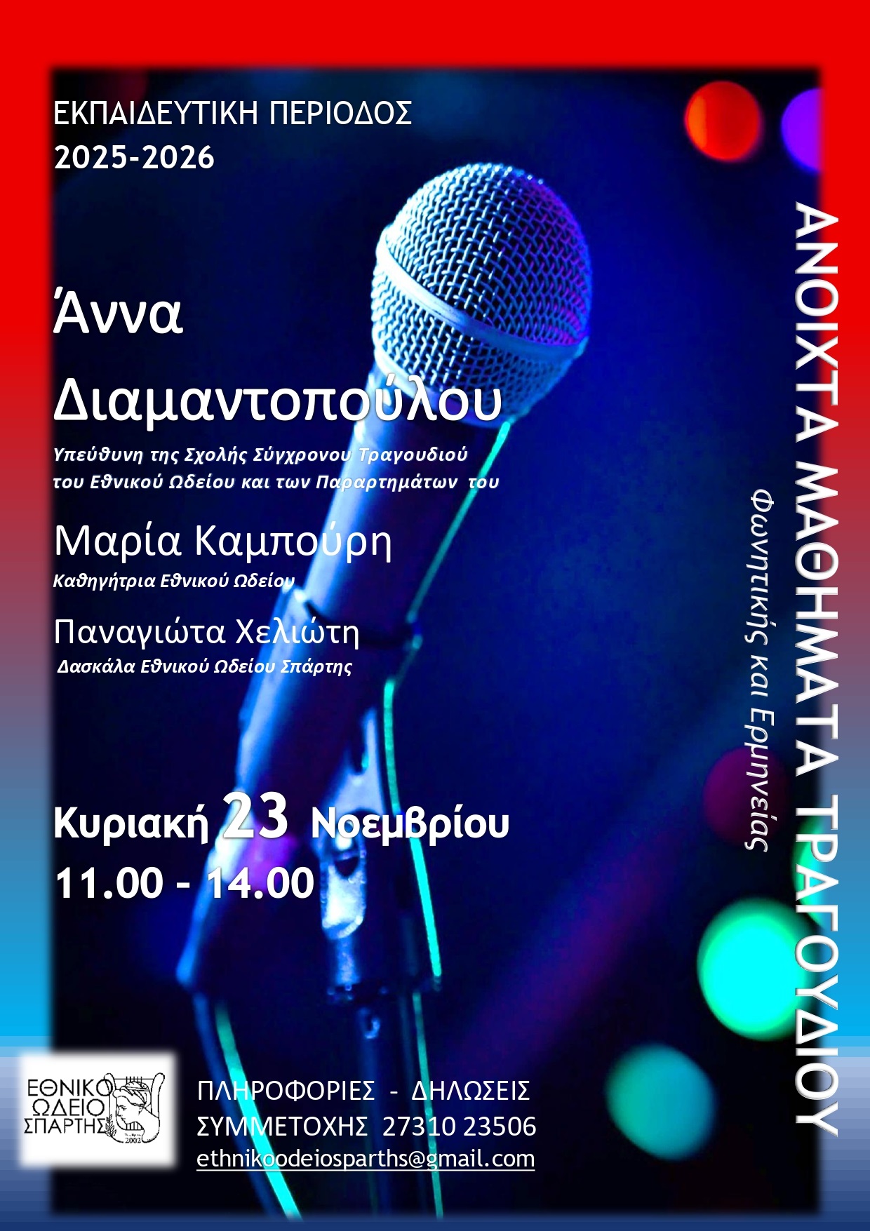Το σεμινάριο θα πραγματοποιηθεί στις εγκαταστάσεις του Εθνικού Ωδείου Σπάρτης (Λεωνίδου 72). Οι δηλώσεις συμμετοχής υποβάλλονται μέσω email στο Αυτή η διεύθυνση ηλεκτρονικού ταχυδρομείου προστατεύεται από τους αυτοματισμούς αποστολέων ανεπιθύμητων μηνυμάτων. Χρειάζεται να ενεργοποιήσετε τη JavaScript για να μπορέσετε να τη δείτε.