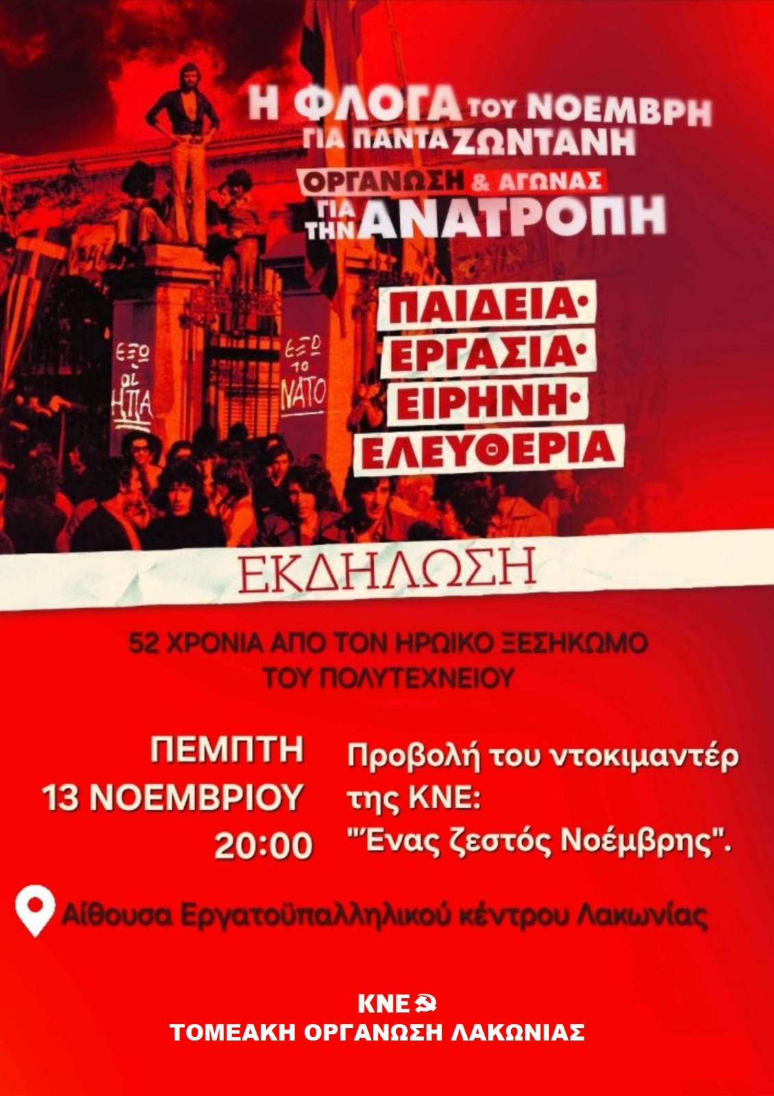 Με αφορμή τη συμπλήρωση 52 χρόνων από τον ηρωικό ξεσηκωμό του Πολυτεχνείου, η Τομεακή Οργάνωση Λακωνίας της ΚΝΕ διοργανώνει την προβολή του ντοκιμαντέρ «Ένας Ζεστός Νοέμβρης» την Πέμπτη 13 Νοεμβρίου, στις 8:00 μ.μ., στο ισόγειο του Εργατικού Κέντρου Λακωνίας.