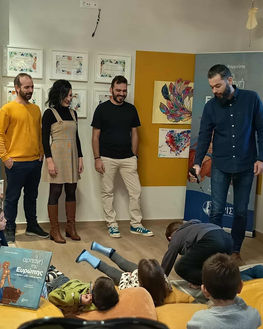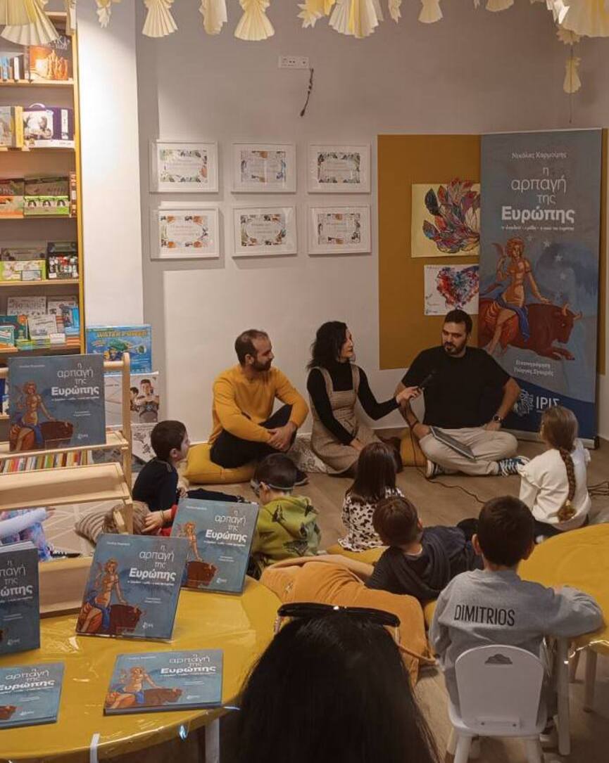 Στο επίκεντρο της εκδήλωσης βρέθηκε ο μύθος της αρπαγής της Ευρώπης, με αφορμή το νέο βιβλίο του συγγραφέα Ν. Ι. Καρμοίρη «Η αρπαγή της Ευρώπης», σε εικονογράφηση Γιώργου Σγουρού. Η ομάδα της «ΙΡΙΣ» παρουσίασε επιλεγμένα αποσπάσματα του έργου, μεταφέροντας τα παιδιά σε έναν κόσμο μυθολογίας, φαντασίας και συμβολισμών.