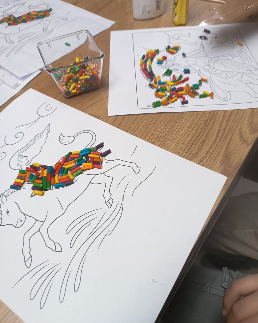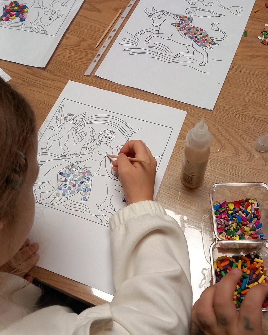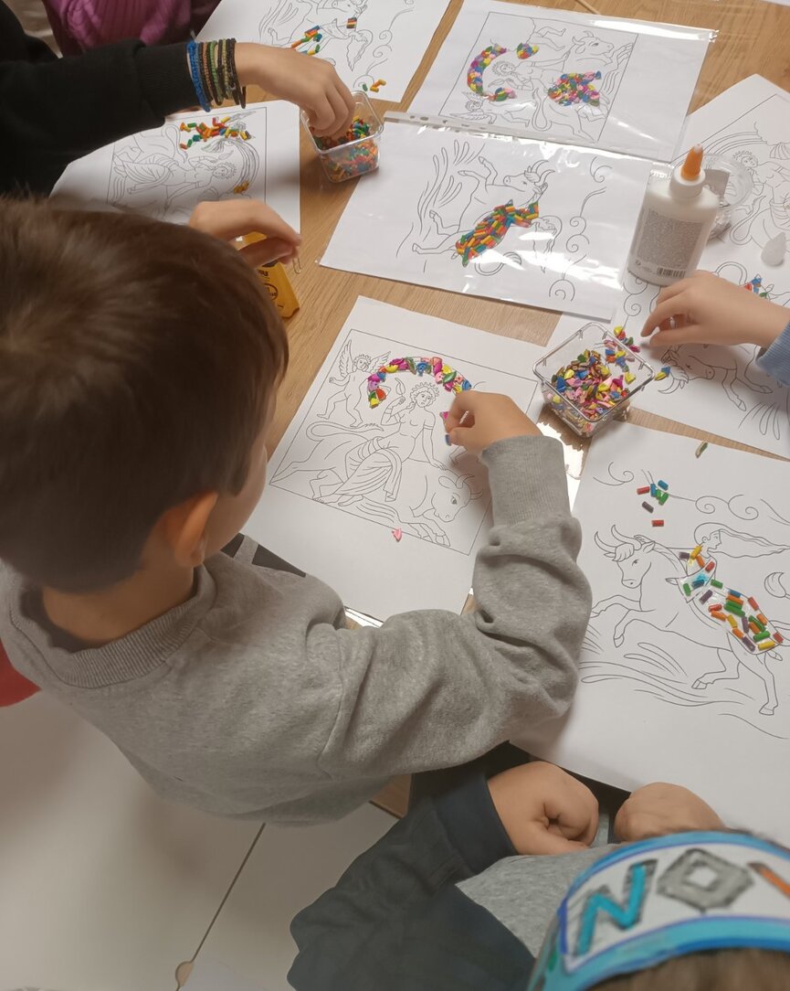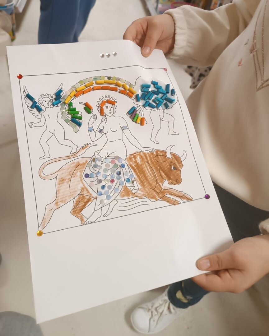 Ακολούθησε συζήτηση γύρω από τον μύθο, αλλά και γύρω από τα γνωστά ψηφιδωτά που κοσμούν τη πλατεία της Σπάρτης, τα οποία αποτέλεσαν πηγή έμπνευσης για το επόμενο στάδιο της δράσης: ένα βιωματικό εργαστήριο χειροτεχνίας. Εκεί, οι μικροί συμμετέχοντες δημιούργησαν τα δικά τους έργα βασισμένα στην τεχνική του ψηφιδωτού, χρησιμοποιώντας χρώματα, μοτίβα και υλικά που ενίσχυαν τη φαντασία και την καλλιτεχνική έκφραση. Η δράση ολοκληρώθηκε μέσα σε ένα κλίμα ενθουσιασμού και συνεργασίας, επιβεβαιώνοντας την αξία της δημιουργικής επαφής των παιδιών με την τοπική πολιτιστική κληρονομιά.