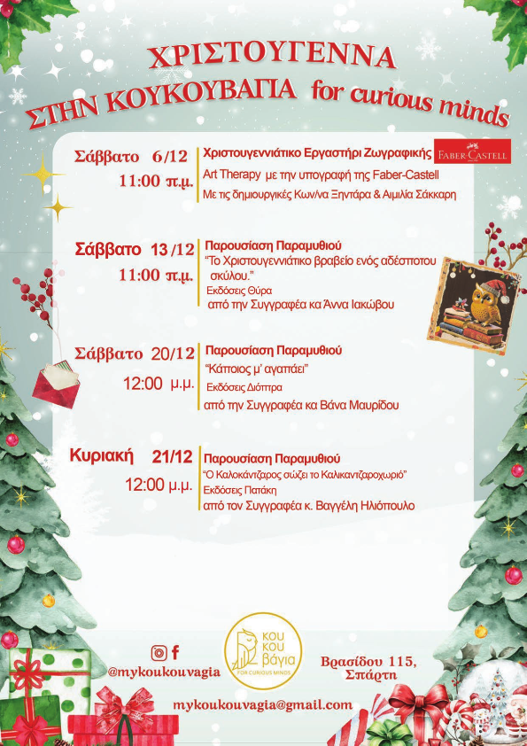 Η «Κουκουβάγια» γίνεται για ακόμη μία φορά σημείο αναφοράς για τους μικρούς αναγνώστες και τις οικογένειές τους, προσφέροντας ουσιαστικές, ποιοτικές και ζεστές χριστουγεννιάτικες εμπειρίες.