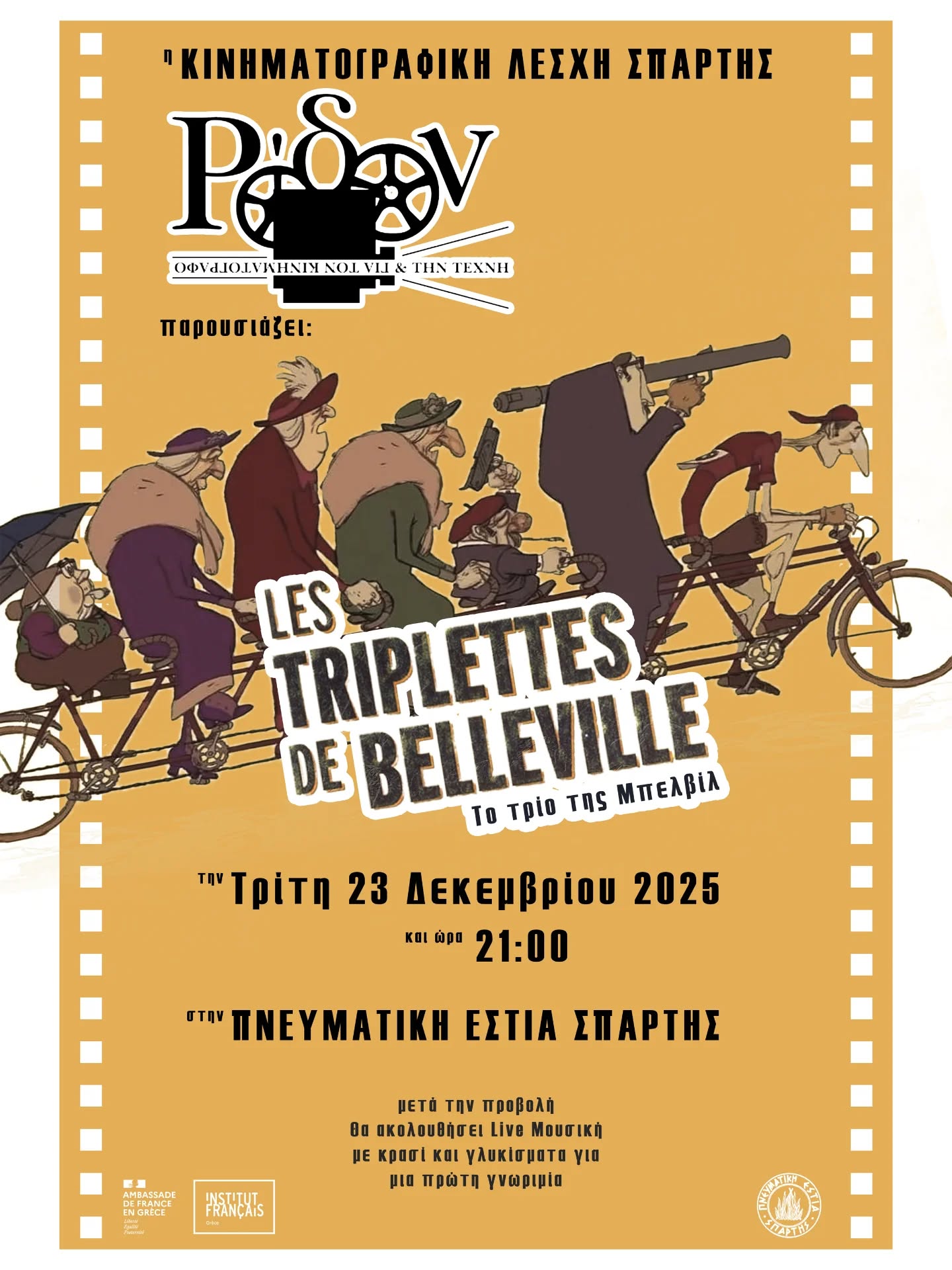 Η επανεκκίνηση γίνεται την Τρίτη 23 Δεκεμβρίου, στις 21:00, στην Πνευματική Εστία Σπάρτης, όπου το «Ρόδον» «πατάει play» και εγκαινιάζει τον νέο κύκλο προβολών του με την ταινία «Το Τρίο της Μπελβίλ» (Les Triplettes de Belleville, 2003), ένα πρωτοποριακό και οπτικά εντυπωσιακό άνιμε για ενήλικες, σε σκηνοθεσία του Γάλλου δημιουργού Συλβέν Σομέ. Πρόκειται για ένα έργο που έχει ξεχωρίσει διεθνώς για την ιδιαίτερη αισθητική του, το ευφυές χιούμορ και την πρωτότυπη αφηγηματική του προσέγγιση, αποτελώντας ιδανική επιλογή για μια δυναμική επανέναρξη.