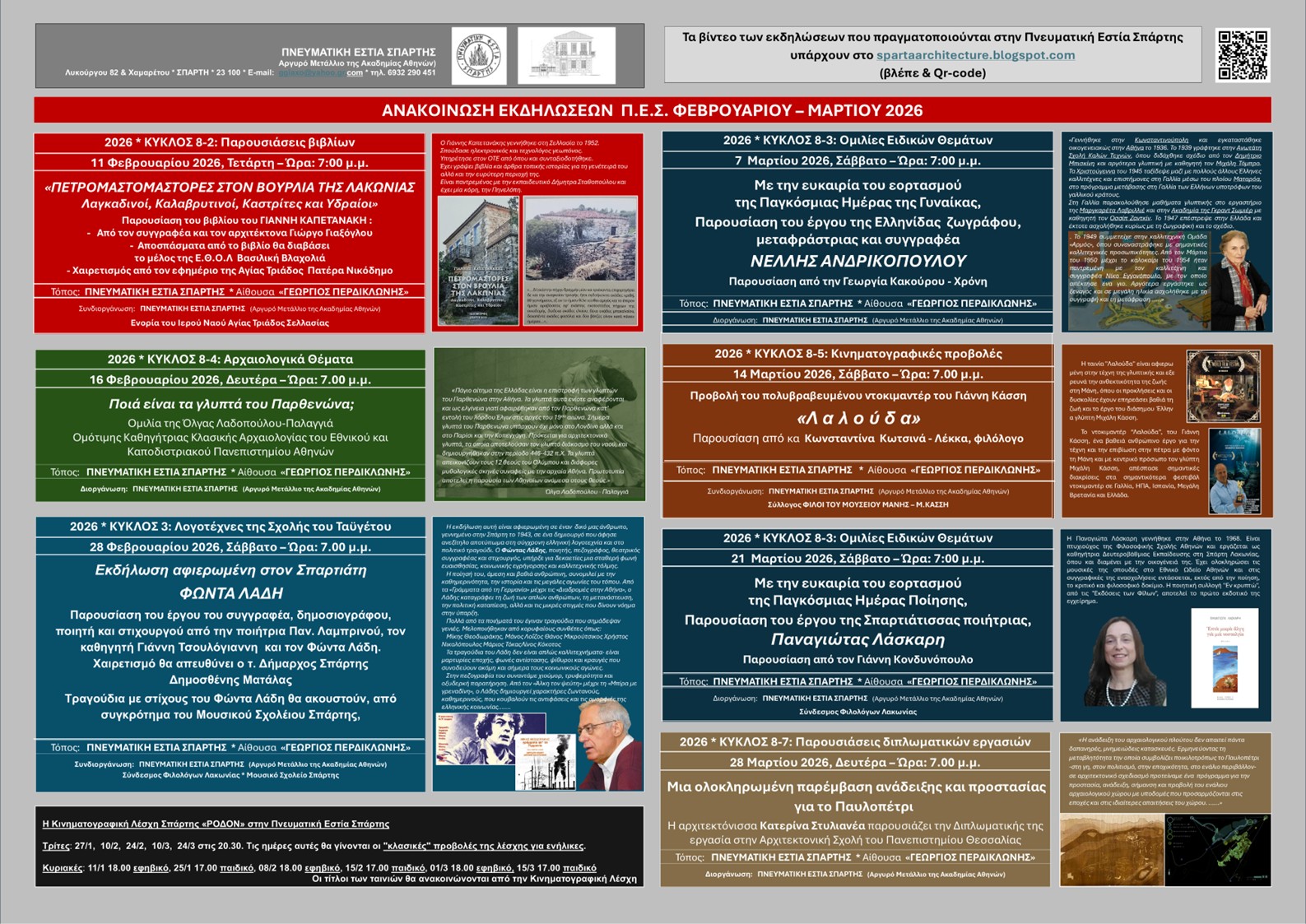 Η Πνευματική Εστία Σπάρτης, με τη θερμή ανταπόκριση του κοινού και τη στήριξη των μελών της, συνεχίζει δυναμικά και το 2026, με στόχο την οργάνωση και προσφορά ποιοτικών πολιτιστικών δράσεων προς όφελος της τοπικής κοινωνίας.