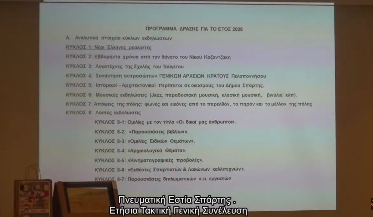 Ο απολογισμός του έτους 2025 ανέδειξε για ακόμη μία χρονιά τον έντονο πολιτιστικό και πνευματικό χαρακτήρα της Πνευματικής Εστίας Σπάρτης, με δράσεις που κάλυψαν ευρύ φάσμα θεμάτων: επιστημονικά, ιστορικά, κοινωνικά, μουσικά και εκπαιδευτικά.