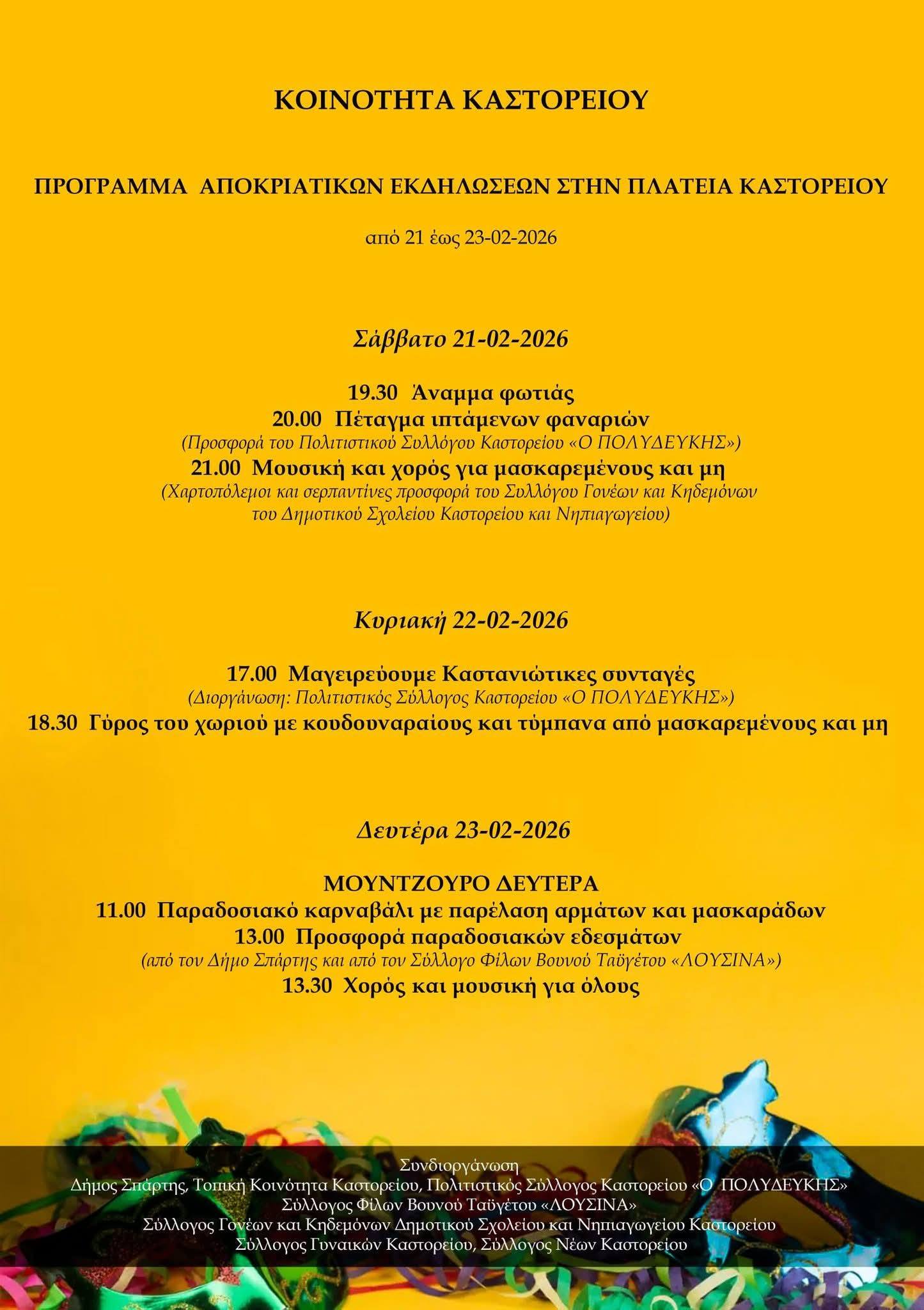 Η Τοπική Κοινότητα Καστορείου προσκαλεί μικρούς και μεγάλους σε ένα μοναδικό τριήμερο αποκριάτικων εκδηλώσεων, από το Σάββατο 21 έως και τη Δευτέρα 23 Φεβρουαρίου, στην κεντρική πλατεία του χωριού. Ένα πλούσιο πρόγραμμα γεμάτο φωτιές, μουσικές, παραδοσιακές γεύσεις, καρναβαλική διάθεση και αυθεντικά έθιμα υπόσχεται να χαρίσει στιγμές κεφιού και συλλογικής γιορτής.