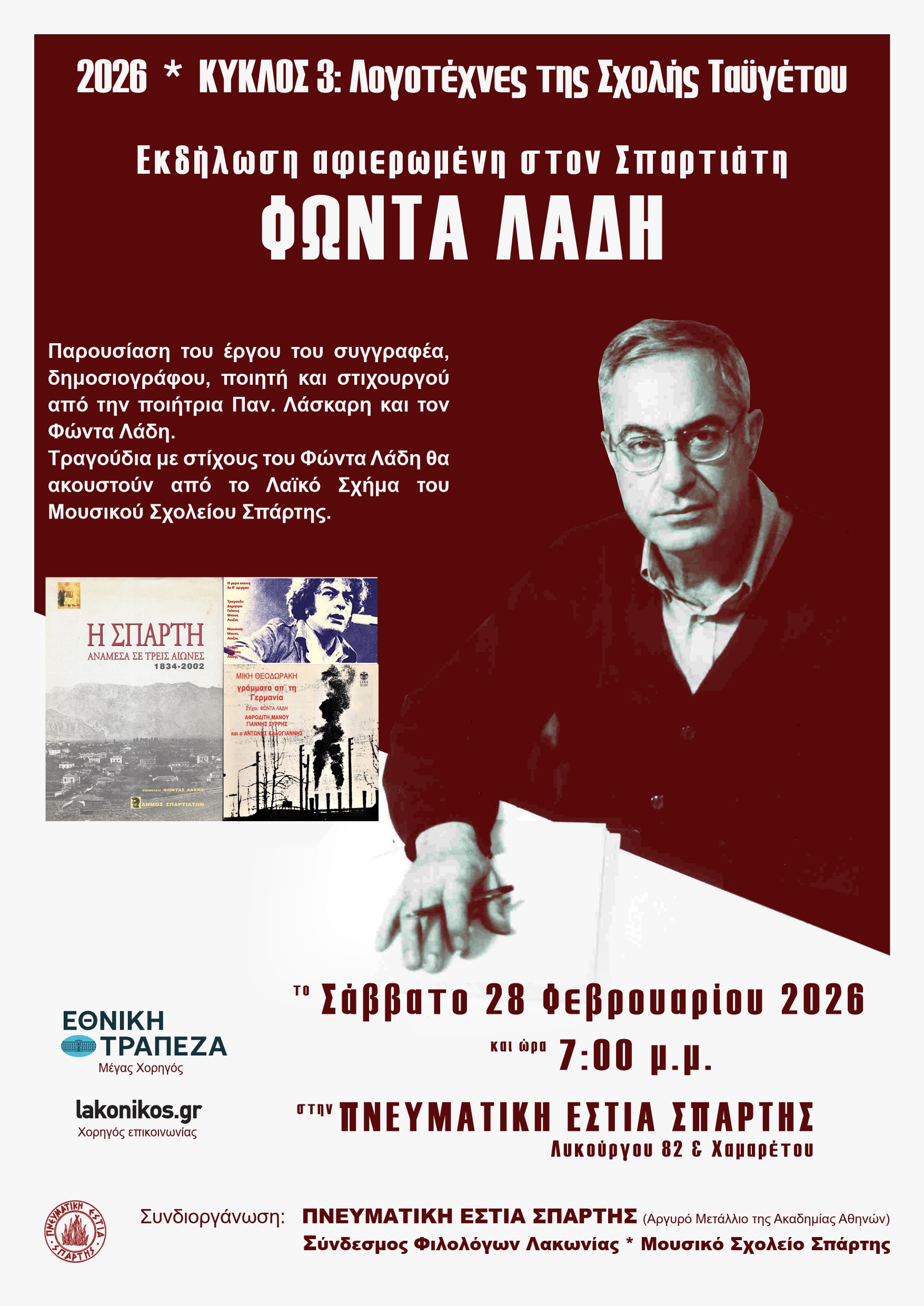 Ένα ξεχωριστό πνευματικό ταξίδι στη ζωή και το έργο ενός από τους σημαντικότερους σύγχρονους Λάκωνες δημιουργούς ετοιμάζεται να ζήσει η Σπάρτη το Σάββατο 28 Φεβρουαρίου, στις 7:00 μ.μ., στο εντευκτήριο της Πνευματικής Εστίας. Η εκδήλωση – αφιέρωμα στον Φώντα Λάδη δεν αποτελεί απλώς μια παρουσίαση βιβλίων και τραγουδιών, αλλά συνάντηση μ’ έναν δημιουργό που κατέγραψε με ευαισθησία, τόλμη και κοινωνική εγρήγορση την ιστορία και τις αγωνίες του τόπου.