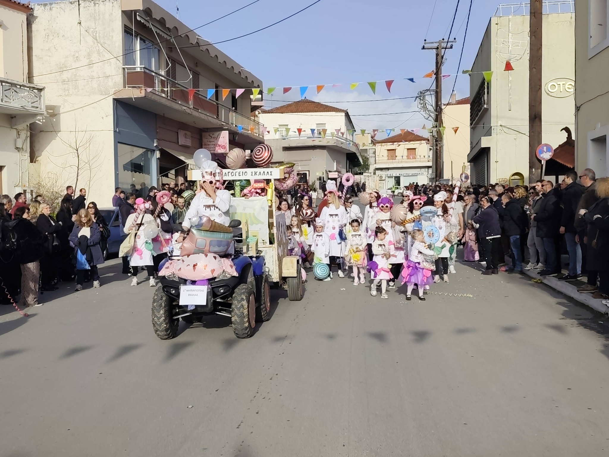 Εξίσου εντυπωσιακή ήταν η εικόνα στο Καρναβάλι της Σκάλας, όπου ο κεντρικός δρόμος της πόλης μετατράπηκε σε έναν μεγάλο πεζόδρομο γιορτής. Θεματικά γκρουπ κάθε ηλικίας, οικογένειες, παιδιά και νέοι συμμετείχαν ενεργά, δημιουργώντας μια ατμόσφαιρα ενθουσιασμού.