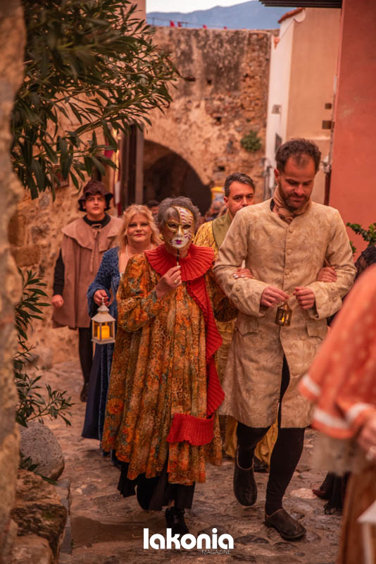 Ξεχωριστή θέση στο αποκριάτικο πρόγραμμα κατείχε και φέτος η καθιερωμένη «Βενετσιάνικη Περαντζάδα», που πραγματοποιήθηκε το Σάββατο 21 Φεβρουαρίου στο κάστρο της Μονεμβασίας. Η ιστορική καστροπολιτεία μετατράπηκε σε ένα ζωντανό σκηνικό άλλης εποχής, καθώς δεκάδες συμμετέχοντες, ντυμένοι με εντυπωσιακές βενετσιάνικες στολές και μάσκες, περιηγήθηκαν στα λιθόστρωτα σοκάκια, δημιουργώντας εικόνες μοναδικής αισθητικής.