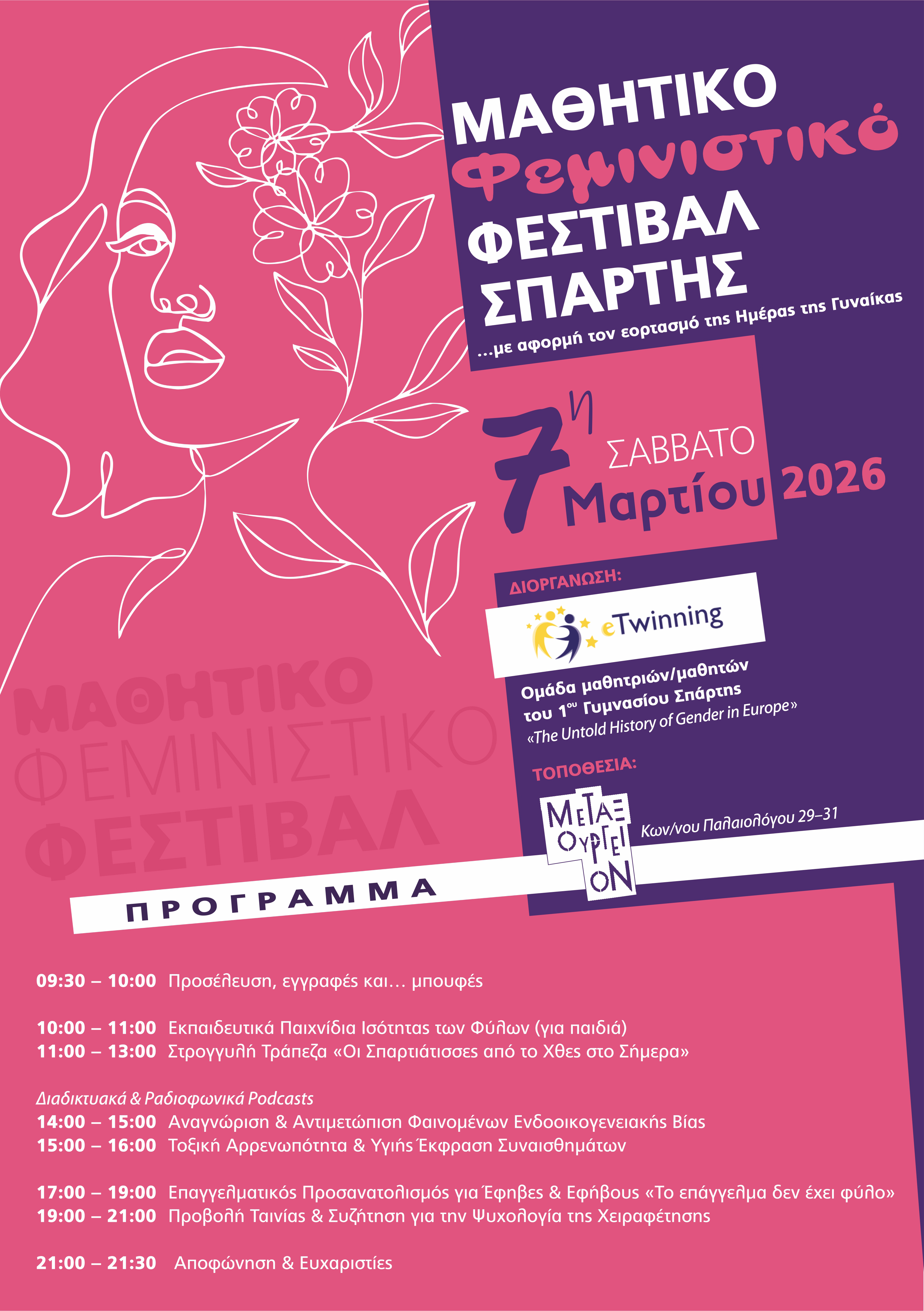 Μια ξεχωριστή, πρωτότυπη και βαθιά ουσιαστική πρωτοβουλία παίρνουν οι μαθήτριες και οι μαθητές του 1ο Γυμνάσιο Σπάρτης, οι οποίοι διοργανώνουν το πρώτο Μαθητικό Φεμινιστικό Φεστιβάλ Σπάρτης, δίνοντας το δικό τους στίγμα στον δημόσιο διάλογο για την ισότητα των φύλων.