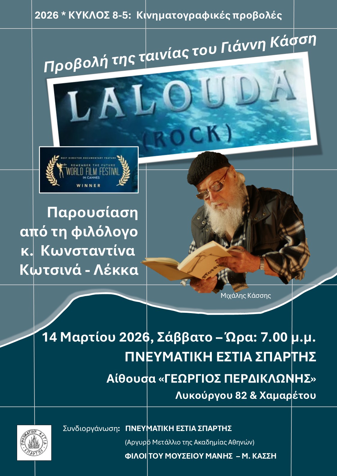 Ένα ιδιαίτερο κινηματογραφικό ταξίδι στην ιστορία, την τέχνη και την αντοχή του ανθρώπου έρχεται στη Σπάρτη το Σάββατο 14 Μαρτίου, στις 7:00 το απόγευμα, με την προβολή του πολυβραβευμένου ντοκιμαντέρ «Λαλούδα (Πέτρα)» του σκηνοθέτη και διευθυντή φωτογραφίας Γιάννη Κάσση. Η προβολή θα πραγματοποιηθεί στην Πνευματική Εστία Σπάρτης, ενώ την παρουσίαση της εκδήλωσης θα κάνει η φιλόλογος Κωνσταντίνα Κωτσινά – Λέκκα.