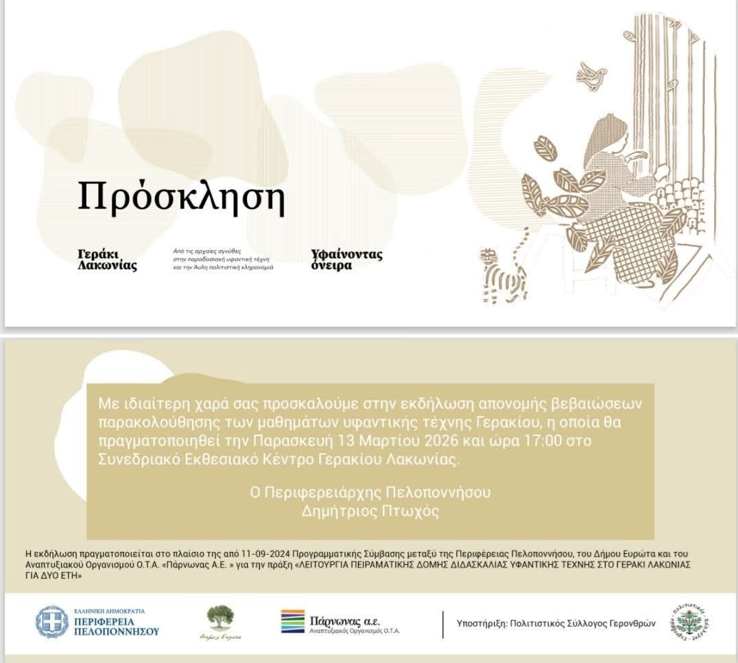 Μια ξεχωριστή εκδήλωση αφιερωμένη στην τέχνη της υφαντικής και στη ζωντανή πολιτιστική παράδοση του τόπου θα πραγματοποιηθεί στο Γεράκι Λακωνίας. Την Παρασκευή 13 Μαρτίου και ώρα 17:00, στο Συνεδριακό Εκθεσιακό Κέντρο (ΣΕΚ) Γερακίου, θα πραγματοποιηθεί η εκδήλωση απονομής βεβαιώσεων στους συμμετέχοντες των μαθημάτων υφαντικής τέχνης στον όρθιο αργαλειό.