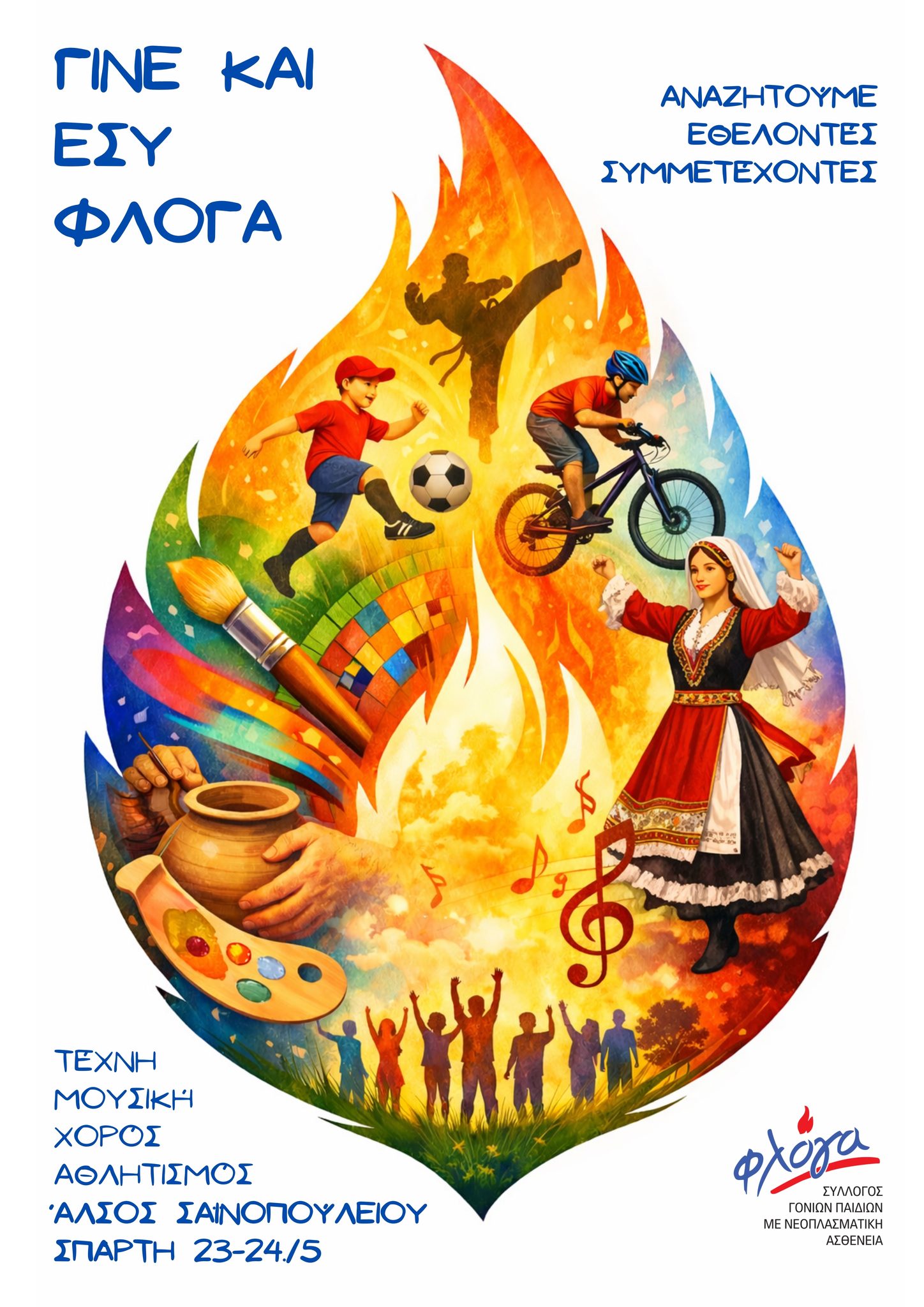 Μια ξεχωριστή ανοιχτή εκδήλωση γεμάτη δημιουργία, κίνηση και πολιτισμό ετοιμάζει στη Σπάρτη ο Σύλλογος Φλόγα – Σύλλογος Γονιών Παιδιών με Νεοπλασματικές Ασθένειες, καλώντας μικρούς και μεγάλους να συμμετάσχουν σε μια μεγάλη γιορτή προσφοράς και αλληλεγγύης.