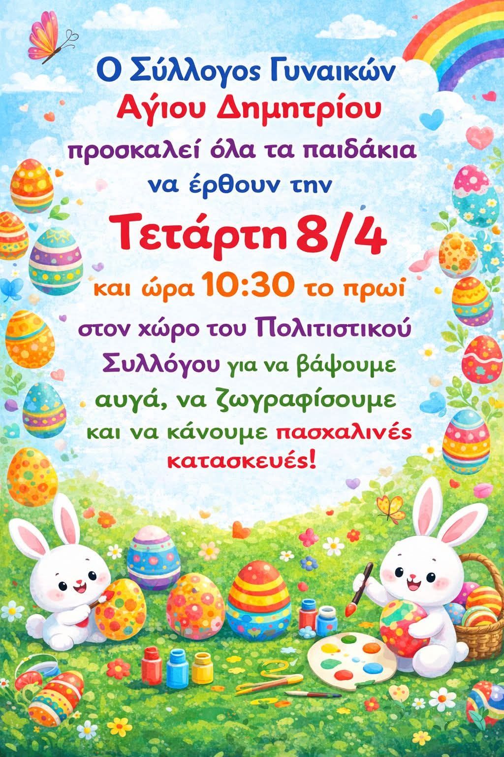 Μια όμορφη και γεμάτη χρώματα πασχαλινή δράση ετοιμάζει ο Σύλλογος Γυναικών Αγίου Δημητρίου, προσκαλώντας τα παιδιά της περιοχής σε μια ξεχωριστή δημιουργική συνάντηση με γιορτινή διάθεση και φαντασία.