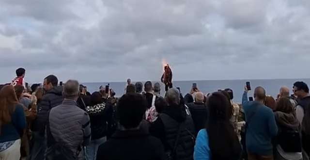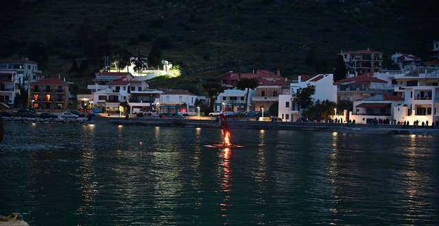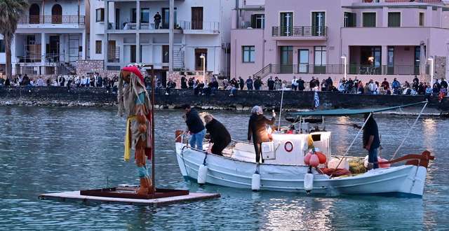 Λίγο αργότερα, στον οικισμό της Γέφυρας, το έθιμο πήρε μια εντυπωσιακή και ξεχωριστή μορφή. Το δεύτερο ομοίωμα τοποθετήθηκε σε πλωτή εξέδρα και, αφού περιφέρθηκε κατά μήκος της παραλιακής ζώνης, παραδόθηκε στις φλόγες μέσα στη θάλασσα. Το θέαμα, με φόντο το επιβλητικό κάστρο της Μονεμβασίας, συνοδεύτηκε από μουσική και πυροτεχνήματα, δημιουργώντας ένα μαγευτικό σκηνικό που καθήλωσε τους παρευρισκόμενους.