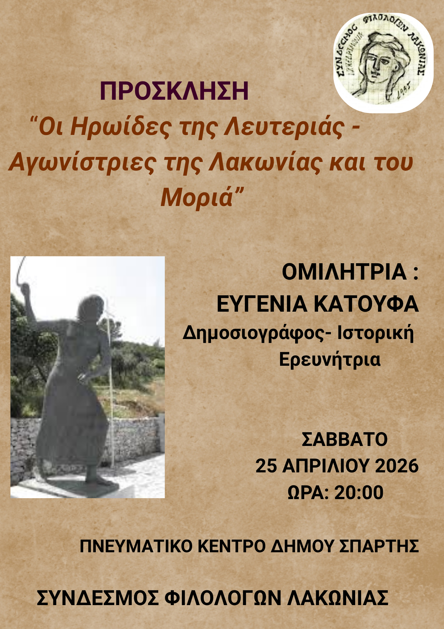 Με στόχο την ανάδειξη της σημαντικής συμβολής των γυναικών στον αγώνα για την ελευθερία, ο Σύνδεσμος Φιλολόγων Λακωνίας διοργανώνει μια ξεχωριστή εκδήλωση-ομιλία το Σάββατο 25 Απριλίου, στο Πνευματικό Κέντρο Δήμου Σπάρτης.