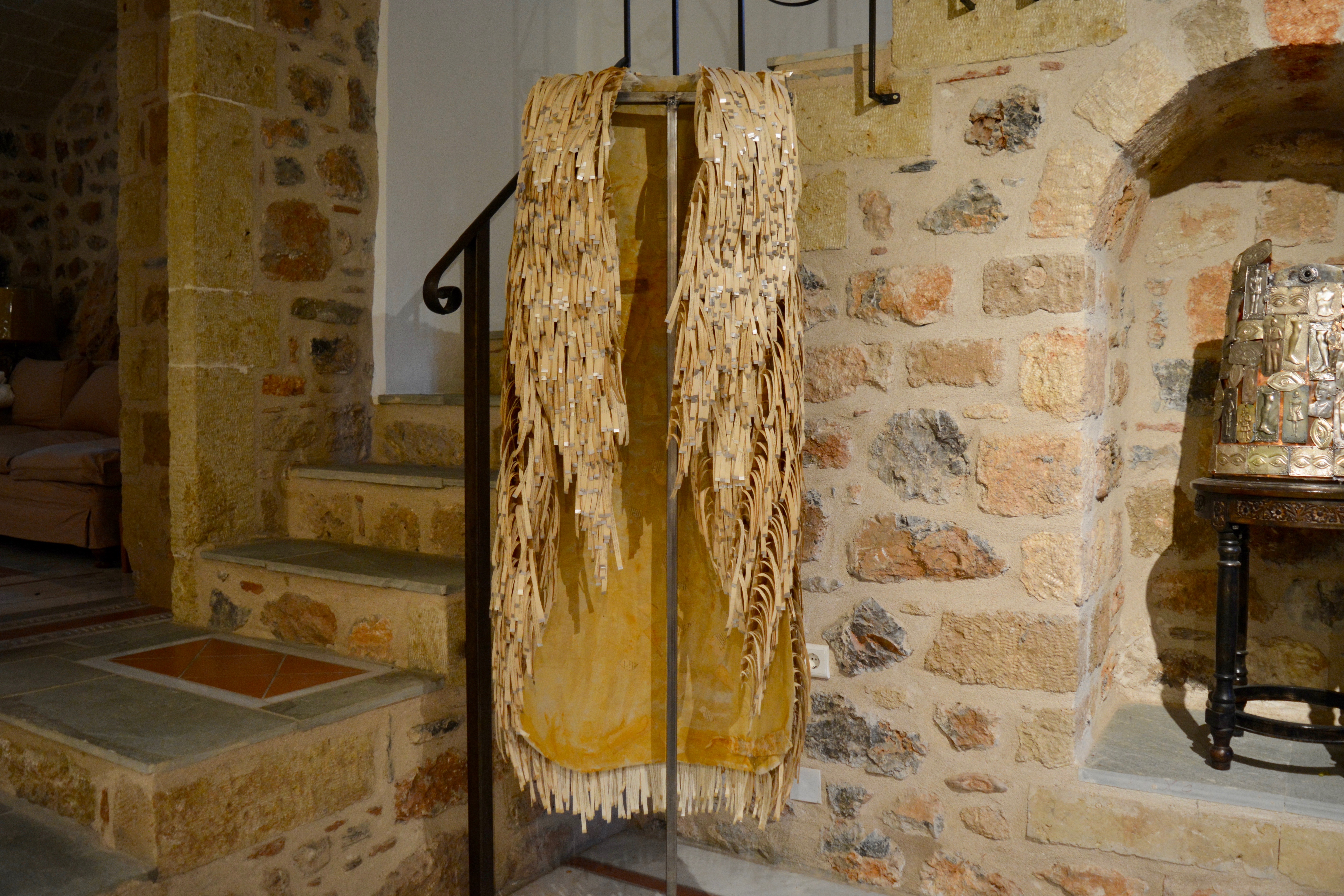 Στα τελευταία έργα - με τη συνεργάτιδά μου - πειραματιστήκαμε με πρώτη ύλη το χαρτί, ένα υλικό αντιθέσεων, ευάλωτο αλλά και σκληρό, εφήμερο και διαχρονικό. Όλα μας τα έργα ήταν σχεδόν εξ ολοκλήρου από χαρτί, κυρίως παλαιά βιβλία-δημοτολόγια του 1940-1950 που ήταν προς ανακύκλωση. Ιδιαίτερης ποιότητας χαρτί, λεπτό και εύθραυστο, που καθρεπτίζει και την τάση της ιστορίας να διαφεύγει εάν δεν καταγράφεται. Διπλώσαμε και ξεδιπλώσαμε κομμάτια χαρτιού, διαμορφώσαμε όγκους, σχήματα, δημιουργήσαμε σχέδια ανάγλυφα ή διάτρητα, ενώσαμε διαφορετικό είδος χαρτιού και πλάσαμε επιφάνειες, ώσπου οι απλές χάρτινες επιφάνειες πέρασαν σε σταθερές μορφές που απέδιδαν συμβολισμούς. Σε κάποια έργα έχει χρησιμοποιηθεί σίδερο και καμβάς-γάζα με μίξη και άλλων υλικών, σκόνες και φύλλα χρυσού, ασήμι, όχι λόγω αναγκαιότητας χρήσης τους αλλά γιατί ως υλικά ενσωματώνουν την ουσία και το μήνυμα των έργων.