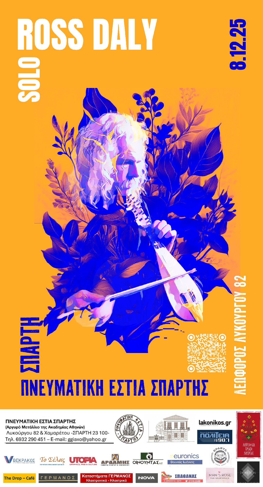 Η σημερινή εκδήλωση σηματοδοτεί μια ξεχωριστή στιγμή για την πόλη, καθώς η Πνευματική Εστία Σπάρτης εγκαινιάζει το πρόγραμμα εκδηλώσεων Δεκεμβρίου ’25 και Ιανουαρίου ’26 φιλοξενώντας τον διεθνούς κύρους Ross Daly. Με μια μοναδική solo συναυλία, στις 19:00, ο σπουδαίος μουσικός και δάσκαλος της τροπικής μουσικής προσκαλεί το κοινό σε μια βαθιά, προσωπική αναζήτηση μέσα στον σύγχρονο τροπικό ήχο. Η παρουσία του στη Σπάρτη και η σημερινή του εμφάνιση αποτελούν μια σπάνια ευκαιρία επαφής με έναν δημιουργό που εξακολουθεί να εμπνέει, να ανοίγει δρόμους και να διευρύνει τα μουσικά μας όρια.
